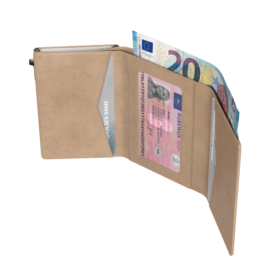 The Classic has a compact design and is smaller than the average wallet. While the card holder is no deeper than 2.7 cm and wider than 7.4 cm, it fits a remarkable amount. To be precise: 10 cards (6 in the card holder and 4 extra on the inside), coins, bills and even business cards! This way you always have all your financial resources stylishly in your trouser or jacket pocket.