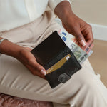 There is a slider at the bottom of the wallet. By pressing this button, the cards are smoothly pushed out of the casing in steps. You can then immediately see which card you need. This way you always have your most important cards ready for use.